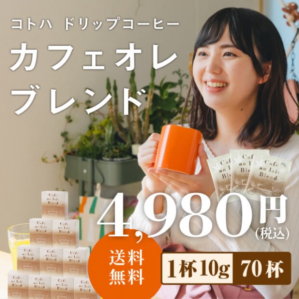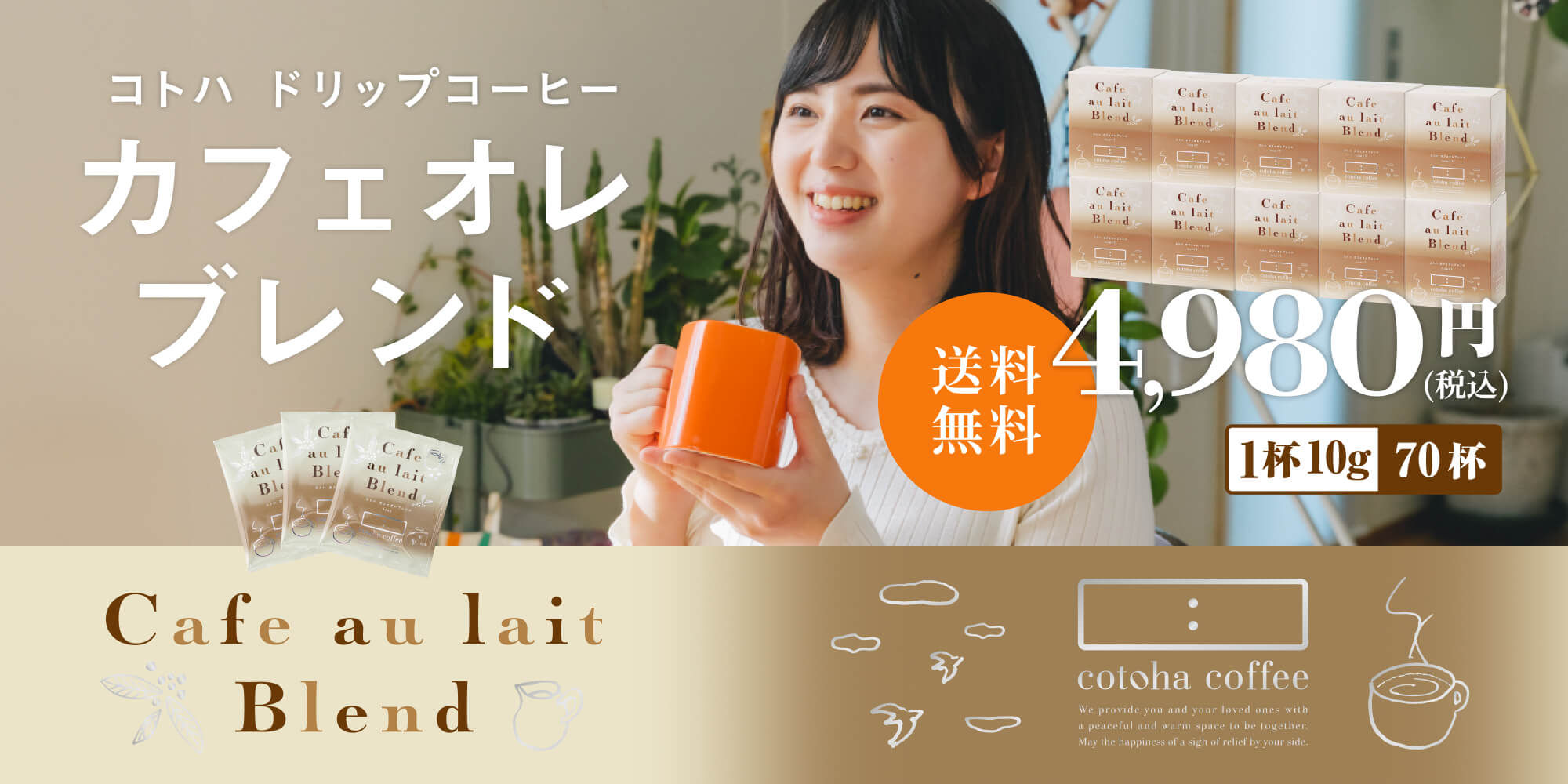 TOP > 特集 > 【1ケース】コトハ ドリップコーヒーカフェオレブレンド70杯(7P×10箱) | 送料無料