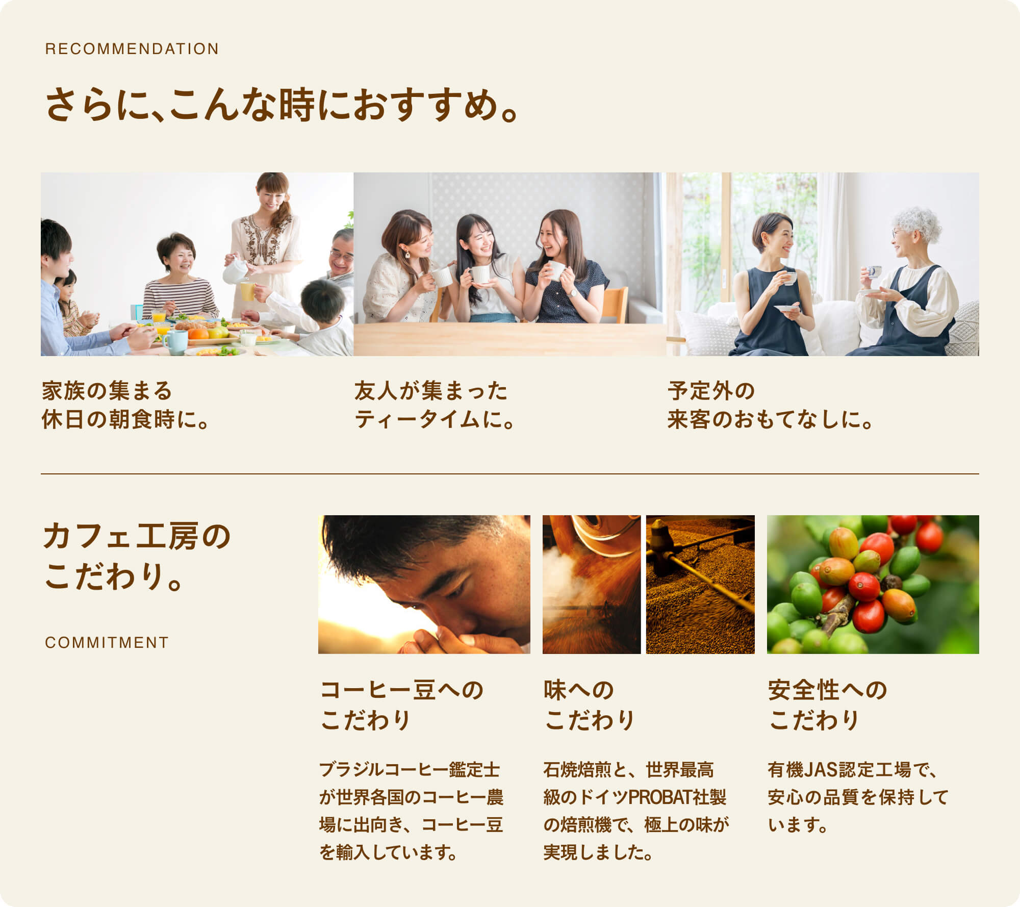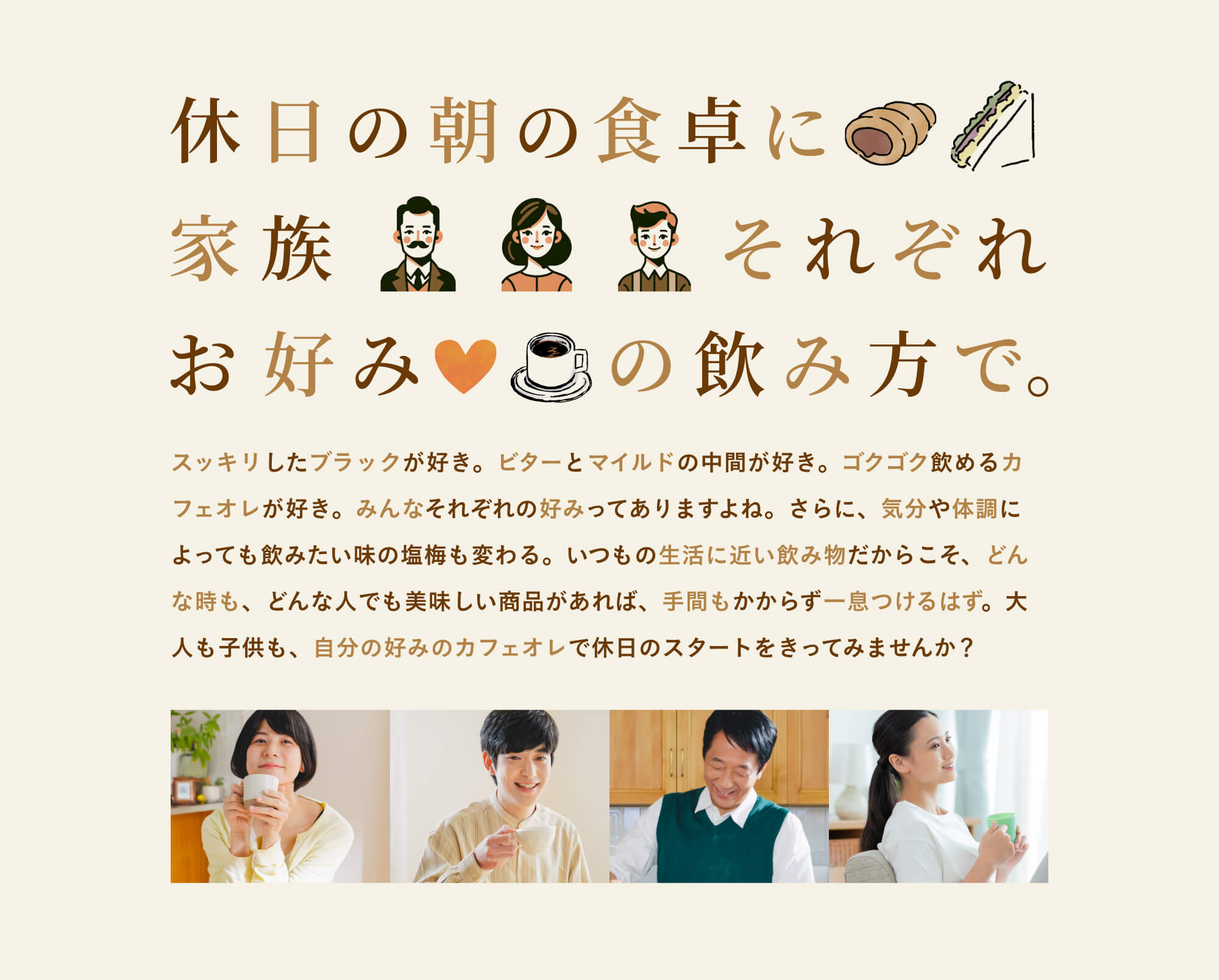 | スタッフの私たち自身がコーヒーにはミルクを入れて飲む事が多いので、ミルクを入れて一番美味しいブレンド作りを模索して、ようやくたどり着いた味がコトハカフォオレブレンドです。何度も試作しているうちに、男性陣はブラックで飲みたい!シャープでさわやかな味。ちょっとミルクを入れると私たちの求めてるカフェオレの味。たっぷりミルクを入れると受験生の子供たちも飲みたいミルクコーヒーになることに気づきました。家族みんなが楽しめるファミリーブレンドに仕上がりました♪是非、ご賞味ください。 |