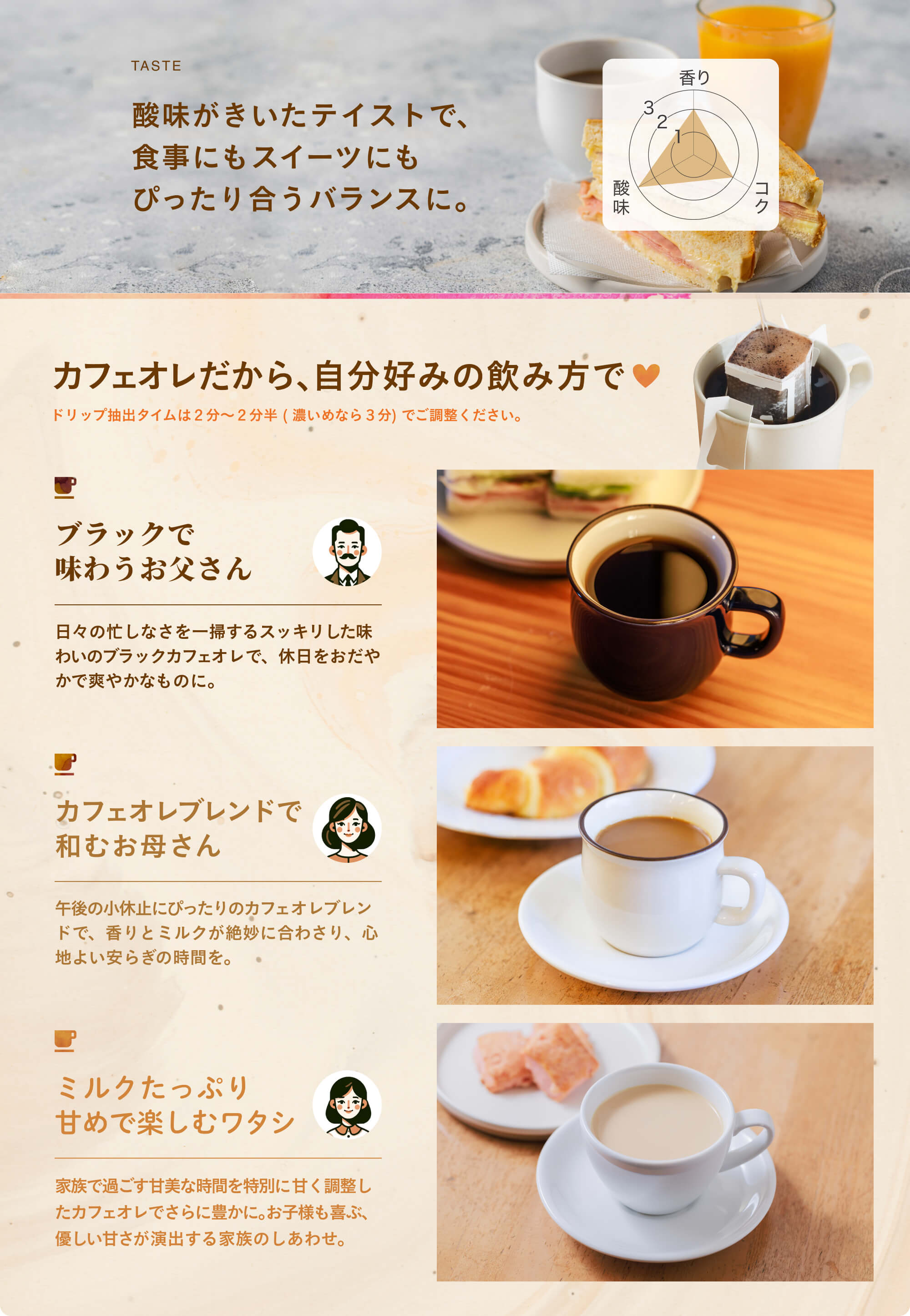 カフェオレブレンドは、濃いめに淹れてミルクを足して美味しくお召し上がりください。
